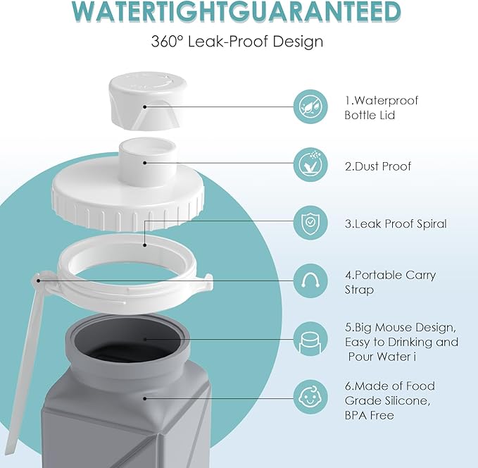 - 【LEAK-PROOF AND EASY-TO-CLEAN】The patented sealing screw cap is used to eliminate leakage and splashing and effectively prevent the bottle from accidentally opening. The wide-mouth design makes it easier to clean the inside of the collapsible soft water container or add ice or lemon to it. ❤When using for the first time, it is recommended to soak in boiling water for 10 minutes for thorough cleaning.