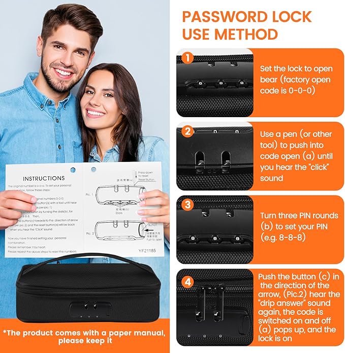 - Privacy protection: This product is equipped with an integrated three-digit password combination lock, and the instruction manual is equipped inside the goods. You can see the password setting method on page 6 of the product diagram. Compared with the storage bag with separate lock head, this bag has better integrity, more beautiful and more convenient