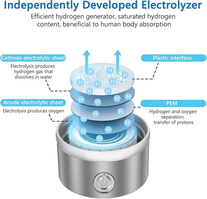 - [Easy to Use]: After pouring 60%-80% of the water into the hydrogen water cup. Just press lightly, the blue light on the bottom lights up and the hydrogen gas decomposes from the water