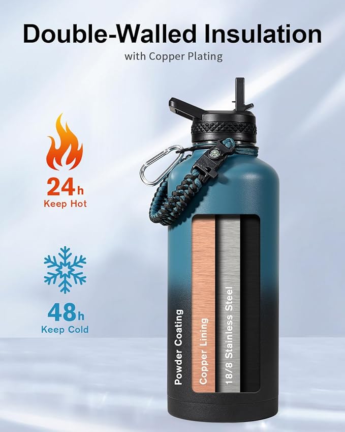 Trebo Water Bottle 87oz with Paracord Handle, Food-grade Double Wall Vacuum Stainless Steel Insulated Jug with Straw Spout Handle Lids, Leakproof Keep Cold & Hot,Indigo/Black