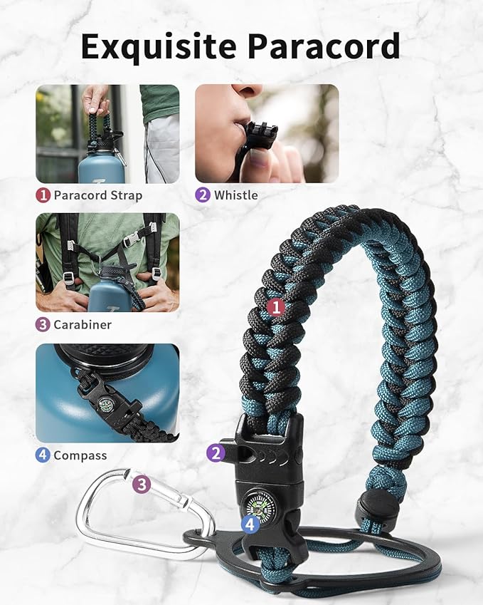 - Full-function Paracord: Brilliant paracord of matching colors bring out the bottle with a touch of youthful vibe. Compact compass and handy carabiner make the bottle the ideal survival kit for expeditions in the wild.