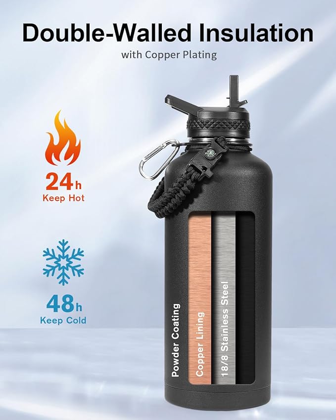 Trebo Water Bottle 87oz with Paracord Handle, Half Gallon Food-grade Double Wall Vacuum Stainless Steel Insulated Jug with Straw Spout Handle Lids, Leakproof Keep Cold & Hot,Black