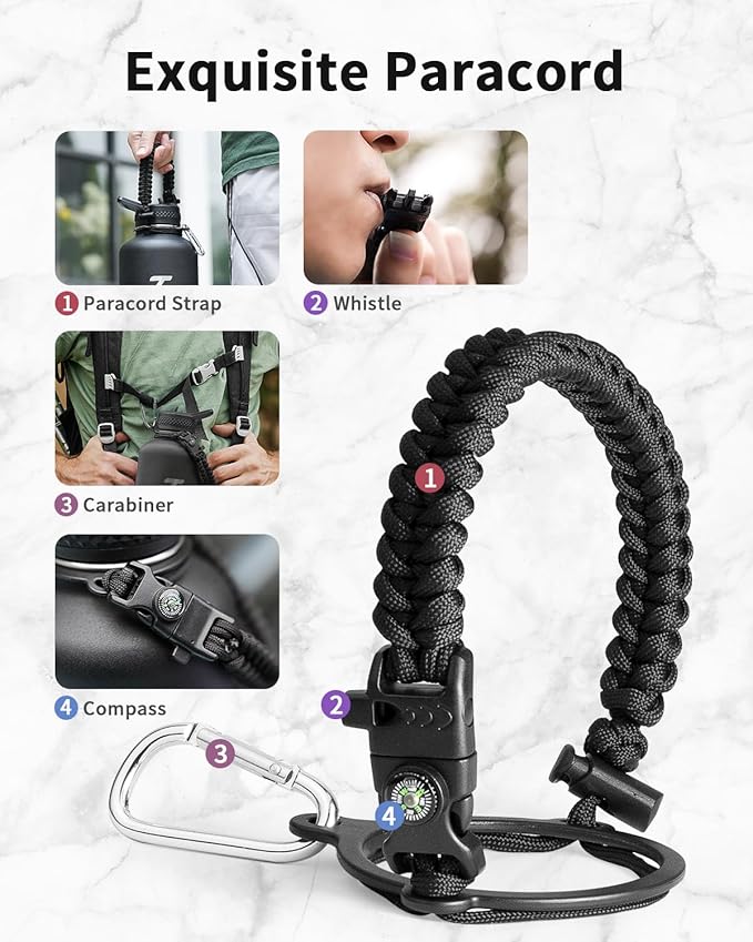 - Full-function Paracord: Brilliant paracord of matching colors bring out the bottle with a touch of youthful vibe. Compact compass and handy carabiner make the bottle the ideal survival kit for expeditions in the wild.