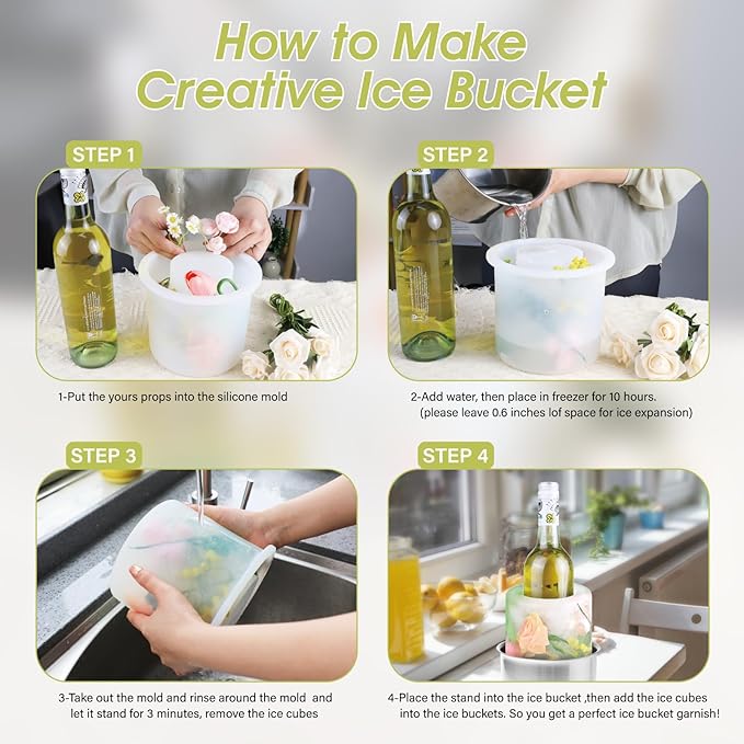 - ใ๐๐จ๐ฐ ๐ญ๐จ ๐๐ฌ๐ ๐๐ฎ๐๐ค๐๐ญ ๐๐๐ ๐๐จ๐ฅ๐ใ๐๐ญ๐๐ฉ ๐: add flowers,fruit,or any props decorations(you want),express your creativity๏ผ๐๐ญ๐๐ฉ ๐: fill the mold with water (please leave 0.6 inches lof space for ice expansion ), then place in freezer for 10 hours. ๐๐ญ๐๐ฉ ๐: Inject some water into the middle of the silicone mold and then rinse round the mold, then wait for 5-10 minutes to remove the ice bucket smoothly. ๐๐ญ๐๐ฉ 4: Put the champagne bottle in it and it's done.