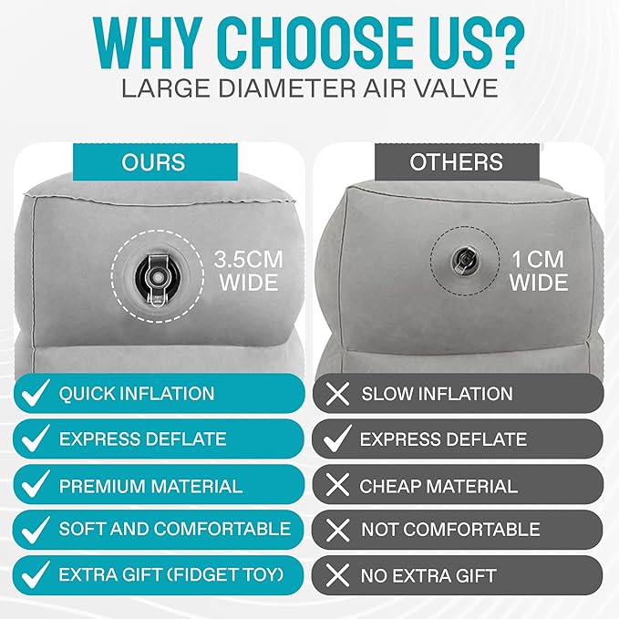 - 【SKIN-FRIENDLY TOUCH & DETAILS】 Made from PVC flocking, our inflatable airplane footrest pillows are both soft and durable, ensuring a comfortable experience for your body. The Airplane travel pillow's plush surface makes it exceptionally pleasant to touch. Additionally, it includes a convenient storage bag (4in4in), allowing you to easily pack the pillow in its deflated state for effortless portability. INFLATED DIMENSIONS: 13.5in18.5in*20.5in.