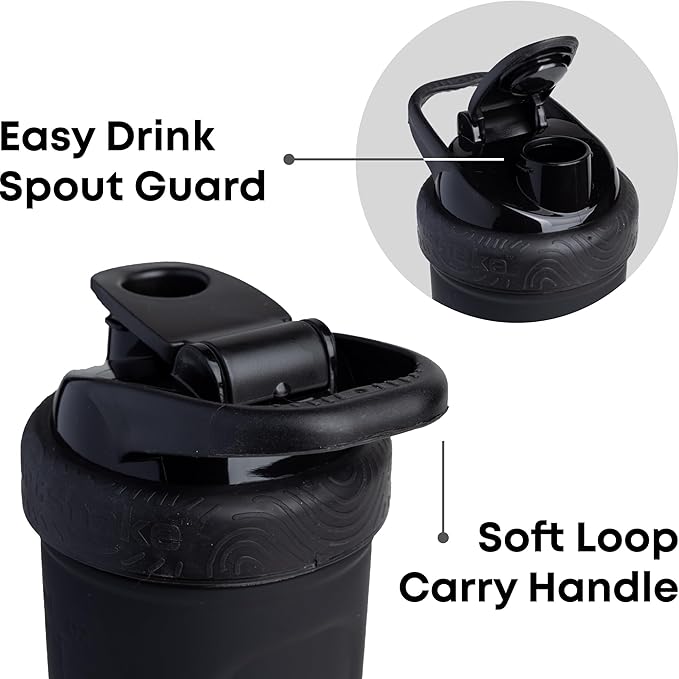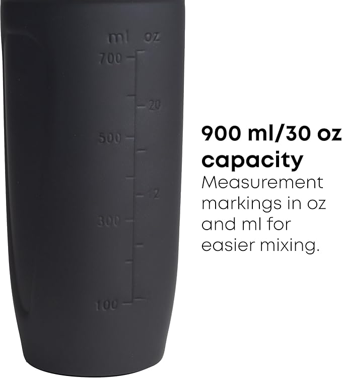 - DURABLE AND ROBUST. This large 900 ml shaker features a soft silicone base, a screw-on leak-proof lid, a soft loop handle and a smooth, matte gray powder-coated finish for a non-slip grip.