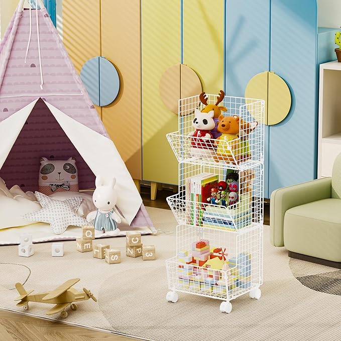 - ROLLING CART & HANGING BASKETS - 3 tier storage baskets together with 4pcs lockable wheels, help you move this rolling storage basket to everywhere you wanted. And install 2 feet increase extra height to keep your kids items away from floor. Also available as wall mount Baskets and floor stand Baskets. You also can use it for a stand-alone basket or stacked for convenience.