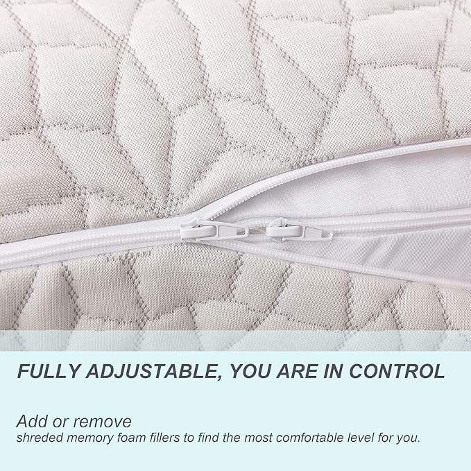 - [ADJUSTABLE Memory Foam Pillow] Too Firm? Too soft? Too thick? Too flat? The cool-feel shredded foam pillow can adjust to your personal preference for just the right balance of support and comfort. An easy access zipper allows you to control the amount of foam you need for a comfortable night's sleep!
