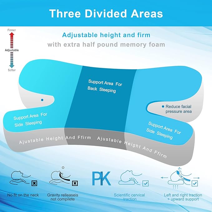 - š ćAdjustablećWith memory foam pillow three divided areas, you can add or remove up to an extra half pound of included filling to change the thickness and/or firmness and softness of adjustable pillow in each individual three areas to be a neck support pillow.