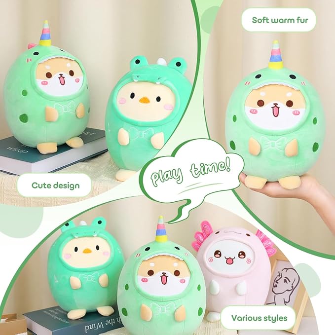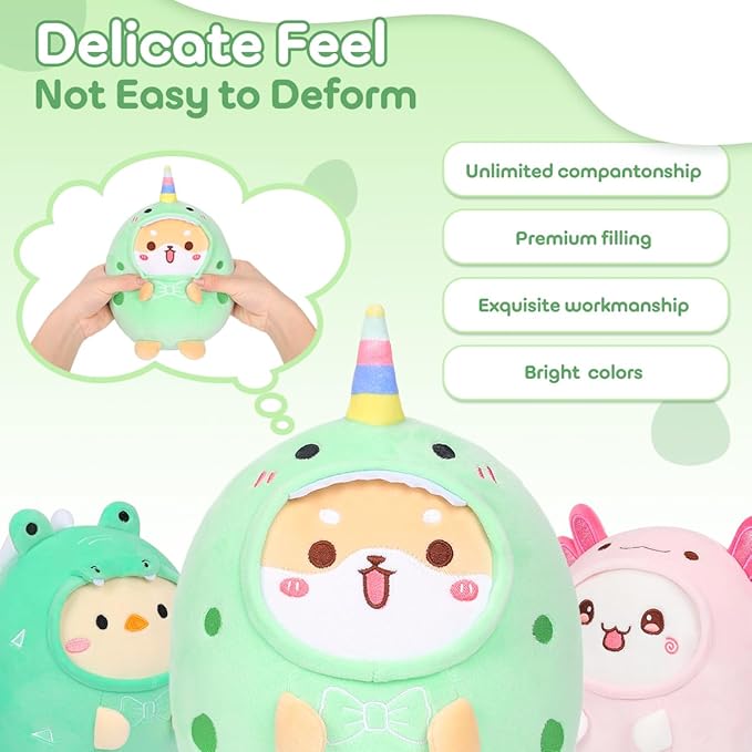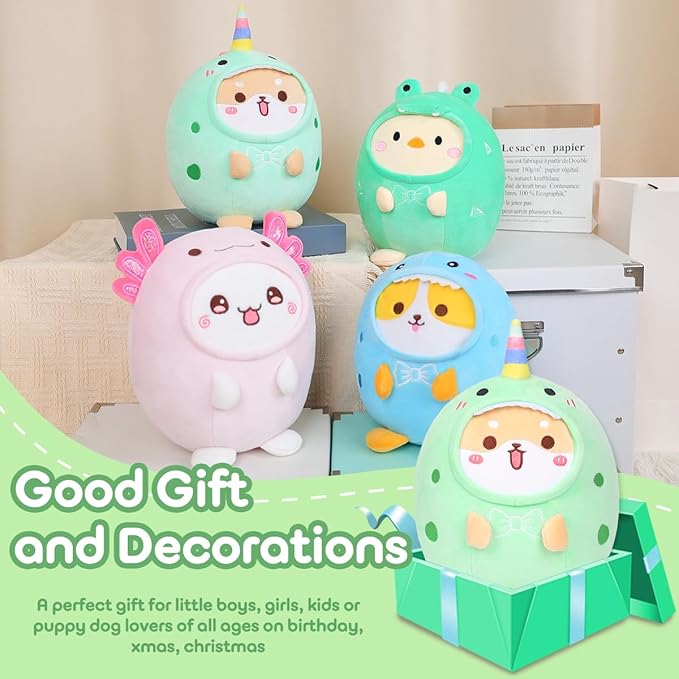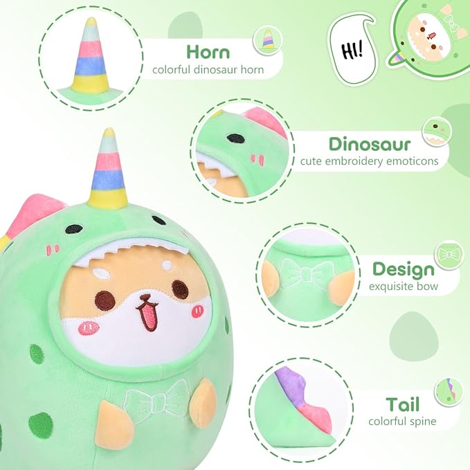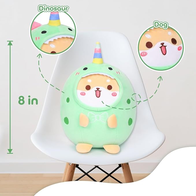 Cute Plush Shiba Inu Dinosaur Stuffed Animal Pillow, 8" Soft Kawaii Akita Plushie with Dinosaur Outfit Gift for Kids