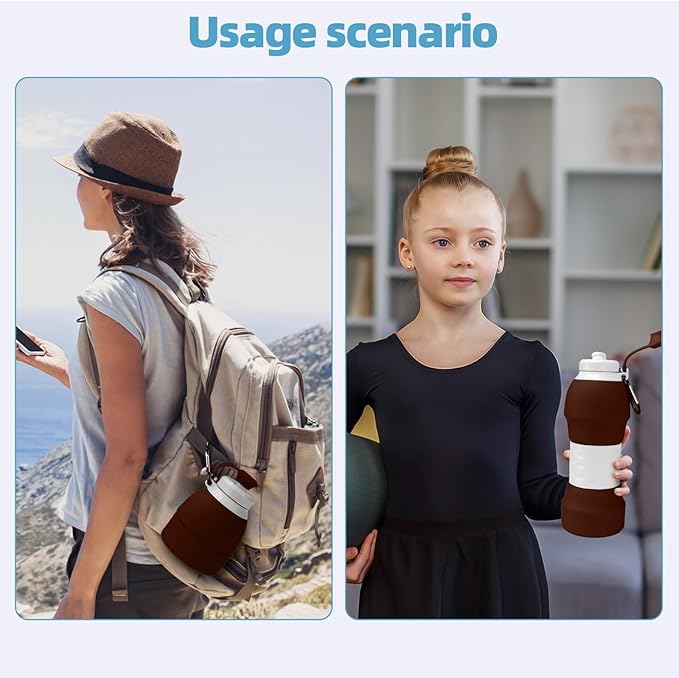 Collapsible Water Bottle, 19.6oz Leakproof Foldable BPA Free Silicone Reusable Sports Bottle, Portable Refillable Bottles with Carabiner, Ideal for Travel Hiking Outdoor Camping Gym (Brown)