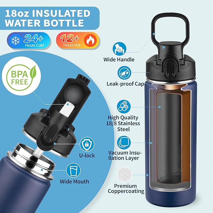Insulated water bottle with Straw,18oz Stainless Steel Water Bottle for Adult Kids,Double Wall Vacuum Wide Mouth Insulated Water Bottle for School,BPA-free and Leak-proofοΌ18oz,Navy blueοΌ