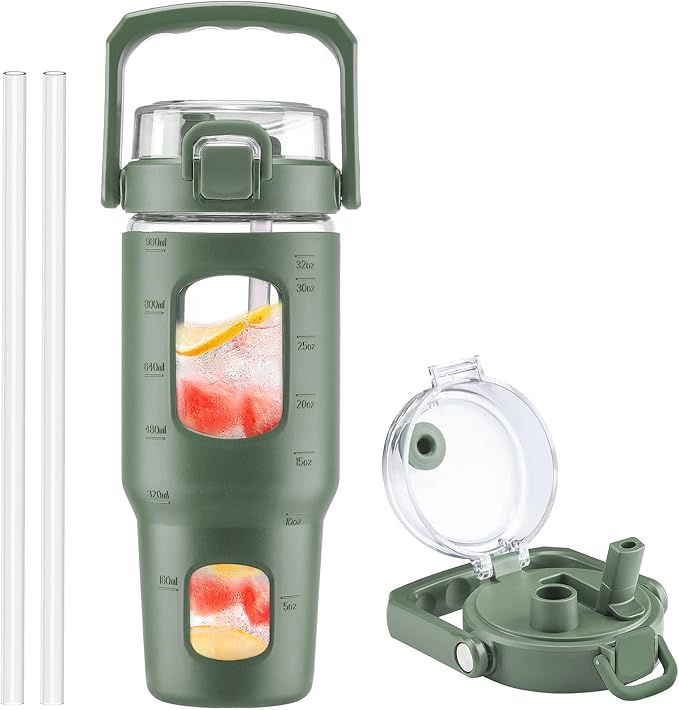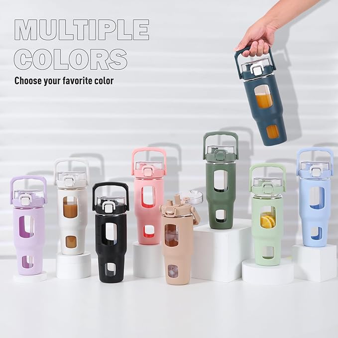 - UNIQUE DESIGN-This glass water bottle features a rotating grip handle and thick silicone sleeve, providing added protection and a secure grip. Crafted from thick borosilicate glass, it's ideal for home, office, or gym workout use. The sport bottle enables two ways to drink water with convenient straw lid, perfect for sipping on the go.