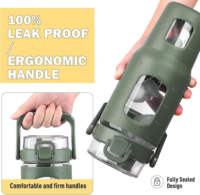 BLUEGO 32oz Glass Water Bottle with Handle and Straw|Leakproof Sports Glass Bottle with Time Marker and Silicone Sleeve|Glass Drinking Bottle for Travel, Gym, Workout, Olive