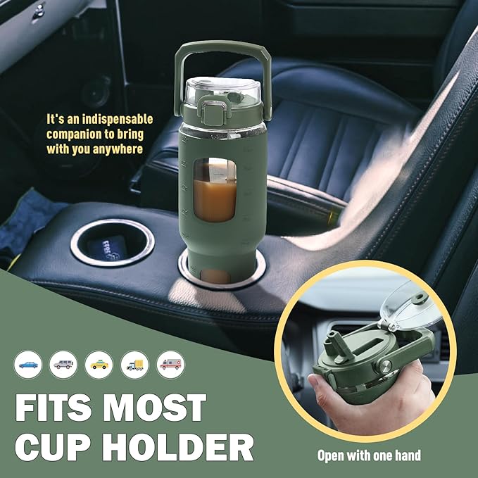 - FITS IN MOST CAR CUPHOLDERS- The glass tumbler with straw and lid design makes your cup stand out from any other glass coffee mugs, and it also fits most car cup holders, you can drink it safely while driving. Open with one hand so convenient for your daily use. The wide mouth is easy to clean and add ice and fruit.