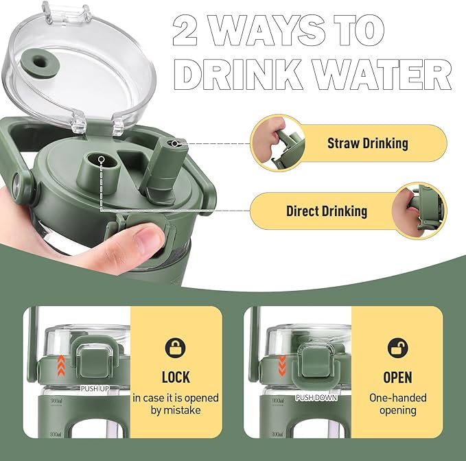 - 100% LEAKPROOF-The 32oz glass water bottle featured with pop up lid with premium safety lock, 100% leak-proof, and can be easily opened with one hand.The sport glass bottles equipped with a comfortable and firm handle and can be one-click lock to prevent any leak or spills by accident. Ideal for Sports and Fitness, It keeps you hydrated after your workout. A must for gym, fitness, camping, cycling, running, yoga and travel.