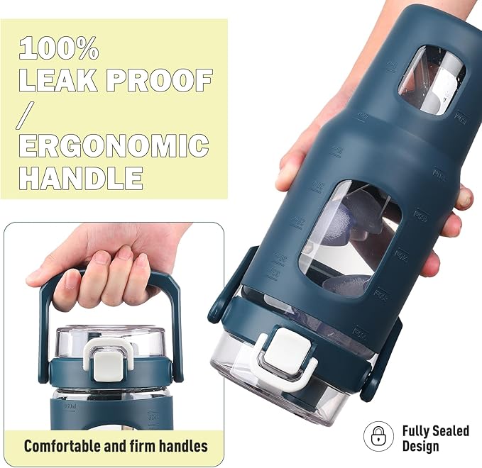 - UNIQUE DESIGN-This glass water bottle features a rotating grip handle and thick silicone sleeve, providing added protection and a secure grip. Crafted from thick borosilicate glass, it's ideal for home, office, or gym workout use. The sport bottle enables two ways to drink water with convenient straw lid, perfect for sipping on the go.