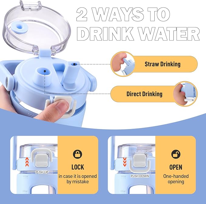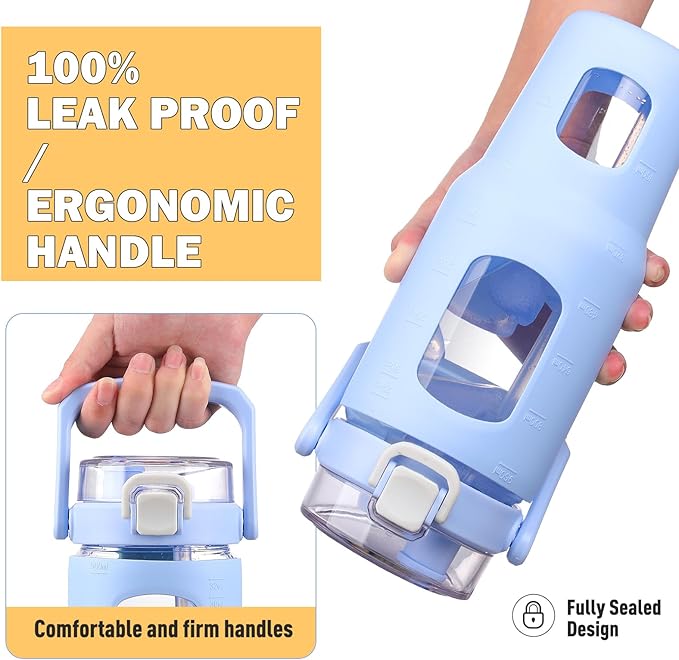 - 🏖️[100% LEAKPROOF]The 32oz glass water bottle featured with pop up lid with premium safety lock, 100% leak-proof, and can be easily opened with one hand.The sport glass bottles equipped with a comfortable and firm handle and can be one-click lock to prevent any leak or spills by accident. Ideal for Sports and Fitness, It keeps you hydrated after your workout. A must for gym, fitness, camping, cycling, running, yoga and travel.