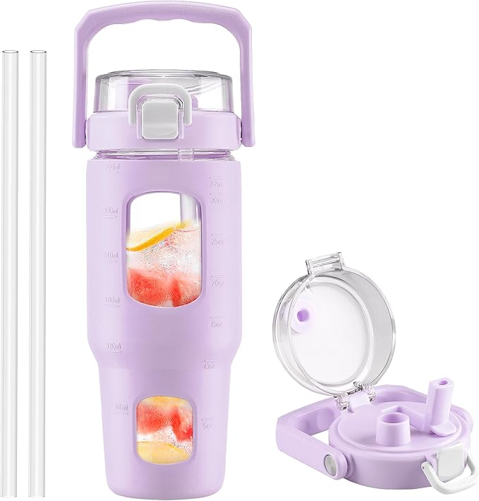 - UNIQUE DESIGN-This glass water bottle features a rotating grip handle and thick silicone sleeve, providing added protection and a secure grip. Crafted from thick borosilicate glass, it's ideal for home, office, or gym workout use. The sport bottle enables two ways to drink water with convenient straw lid, perfect for sipping on the go.