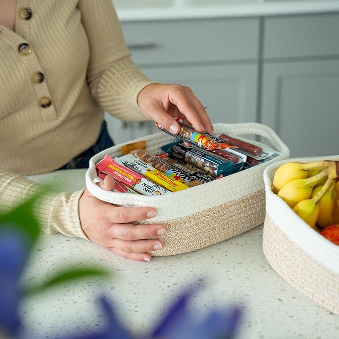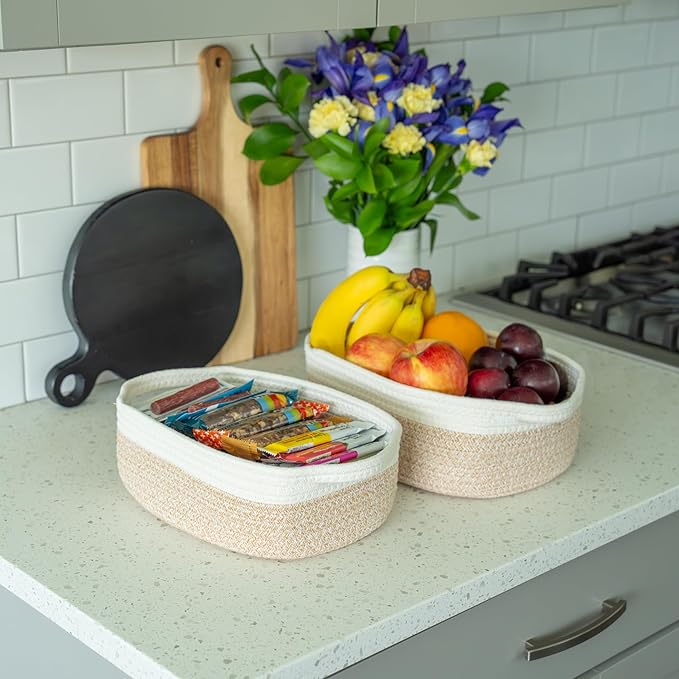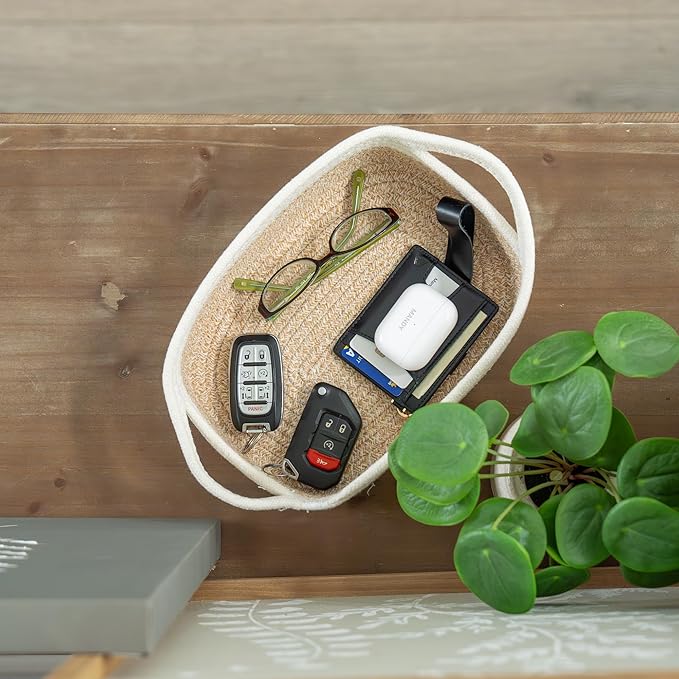 - Premium Woven Cotton Rope Baskets: These beautiful small rope baskets for bathroom provide just the right depth for displaying home decor in a kitchen, storing hand towels in the bathroom, as a baby basket organizer for nursery decor, or as a front entry catch-all.