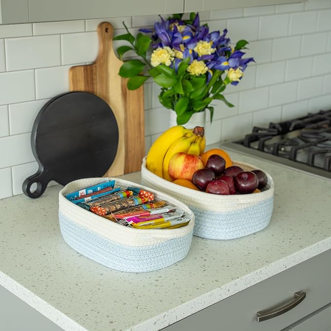 - Premium Woven Cotton Rope Baskets: These beautiful small rope baskets for bathroom provide just the right depth for displaying home decor in a kitchen, storing hand towels in the bathroom, as a baby basket organizer for nursery decor, or as a front entry catch-all.