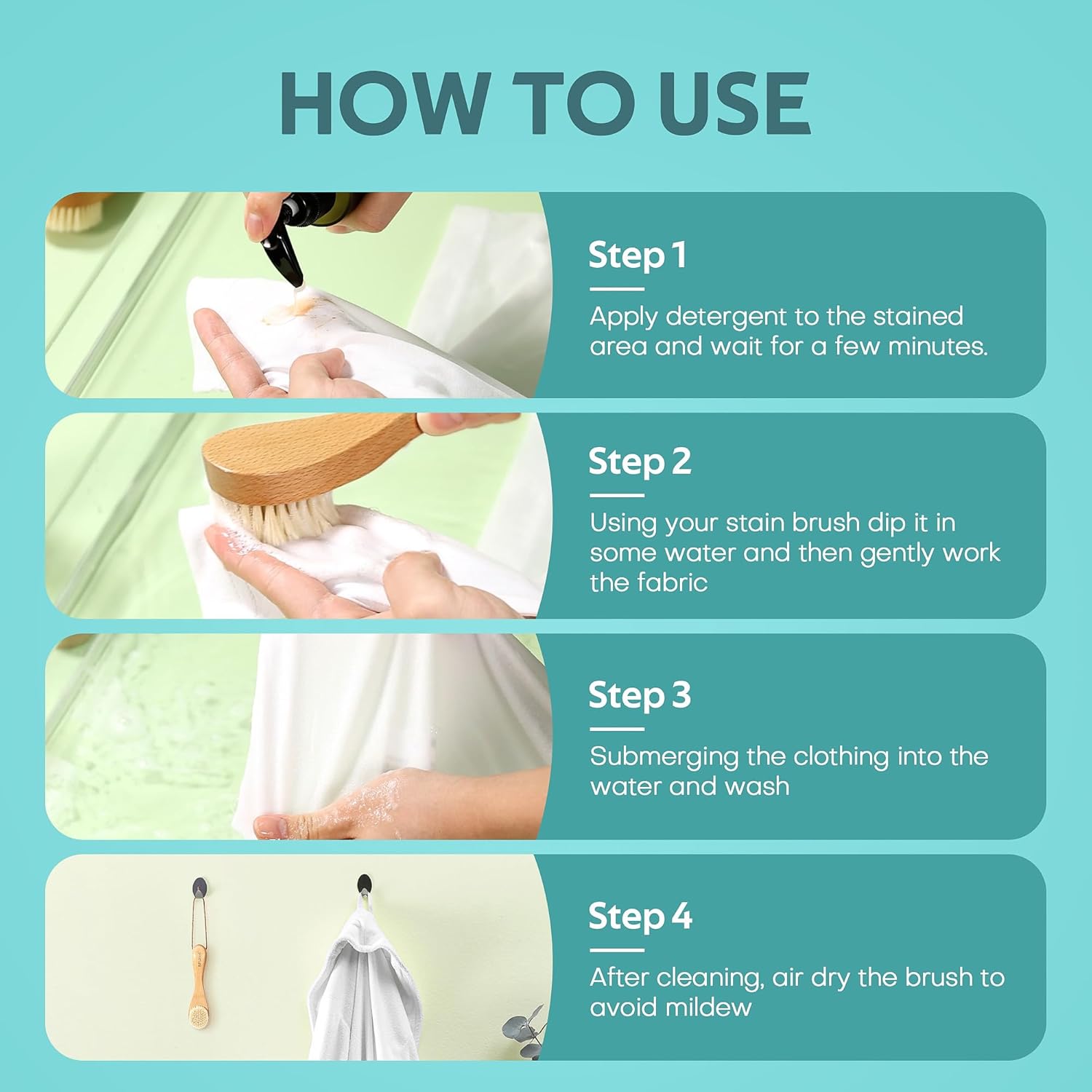 - Reduce Waste: Don’t discard garments with small stains! Our stain brush helps work detergent and stain remover deep into fabric fibers, allowing the remover to effectively lift stains. Your garments will look clean and fresh, ready to wear for years