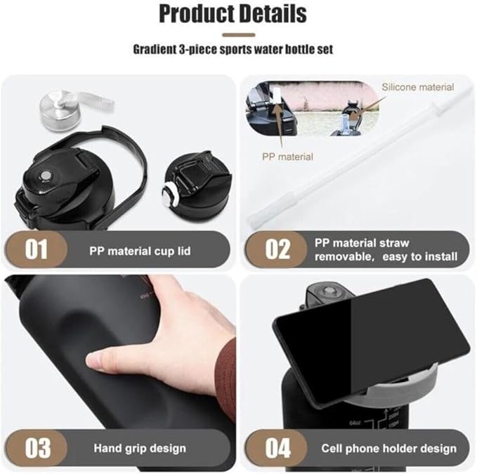 Generic Stay Hydrated in style 3-in-1 Piece Motivational Water Bottle Set with Time Marker, Leak-Proof and BPA-Free Design - Perfect for fitness activities and outdoor adventures!, Black