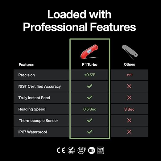 - Certified Accuracy: Officially certified by NIST (National Institute of Standards and Technology), ThermoMaven digital meat thermometer always provides 0.5°F (0.3°C) accuracy, ensuring you get precise temperature readings and cook meats to the desired level of doneness without overcooking or undercooking.