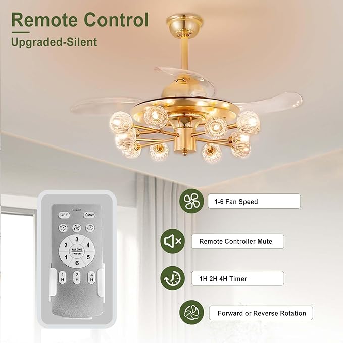 - Timing & Memory Function: Gold crystalceiling fan for bedroom has 3 timer setting (1H/2H/4H) and memory function, so you don't need to go through these tedious settings every time. In addition, sputnik fandelier ceiling light with fan ​operate with noise levels below 30dB, ensuring a comfortable and quiet space environment for you