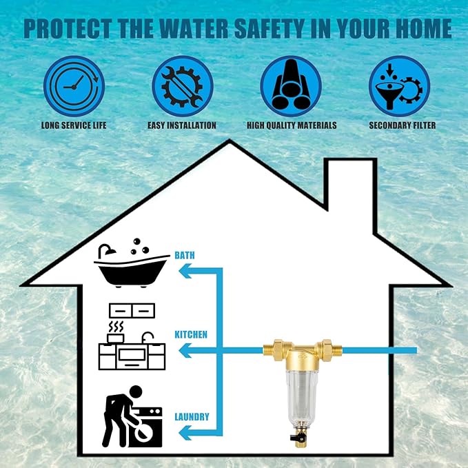 - Easy to install: Our whole house water filter has double threads at both ends, 1-inch MNPT and 3/4-inch FNPT, and is equipped with 3/4-inch NPT connector to adapt to different pipes in your home, with higher adaptability.