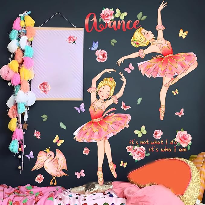 - 【Stylish Pattern】Dancing girl wall decals, rose butterfly swan print art and modern design into an eye-catching mural. This sticker is very suitable for nursery, bedroom, playroom, living room, adorable kids room decor.