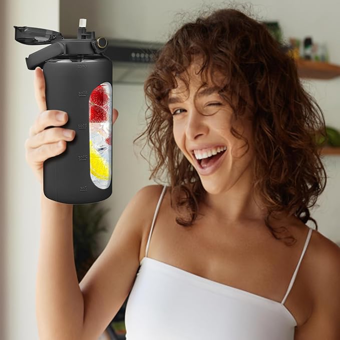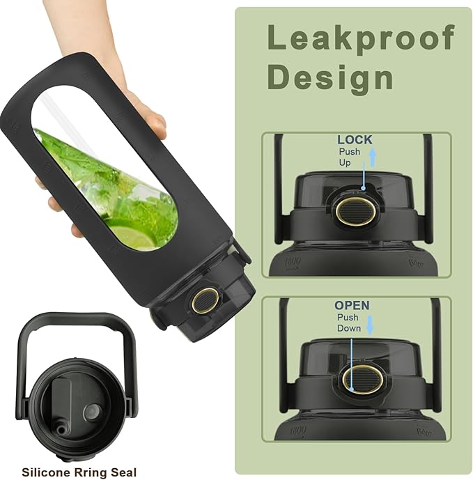 - 【A Motivational Water Bottle 】 Our half gallon glass water bottle with straw can hold 64oz of water, which is equivalent to the 8 cups of water recommended by scientists for humans to drink every day, helping you maintain moisture and drink enough water throughout the day.