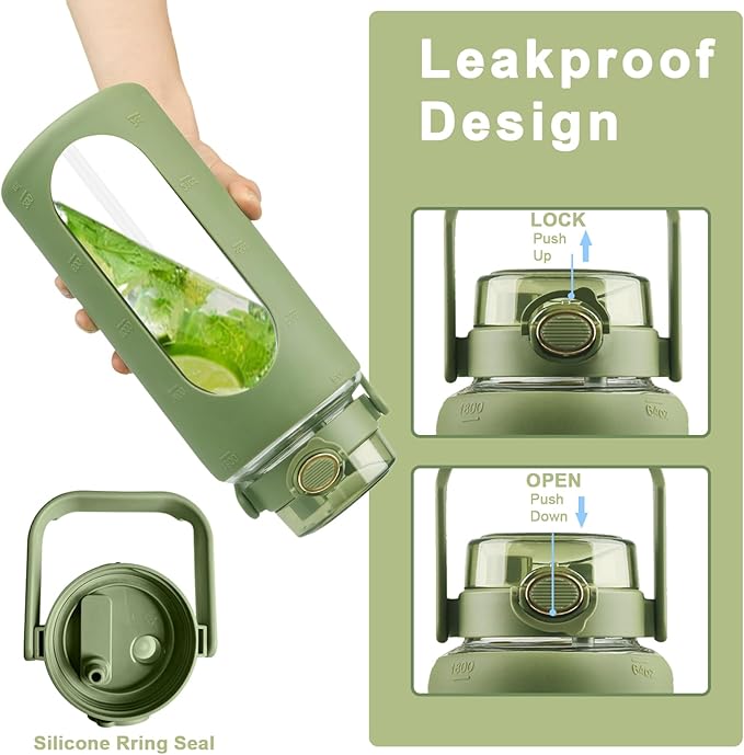 64 Oz Glass Water Bottle with Straw and Lid, Sports Motivational Water Bottle, Leakproof Water Jug Fitness with Silicone Sleeve for Gym, Green