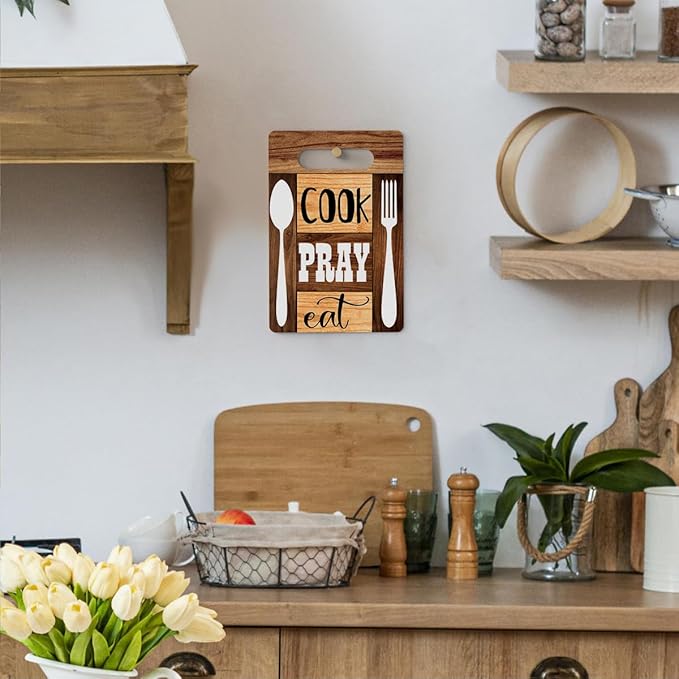 Farmhouse Kitchen Decor, Kitchen Signs Wall Decor, Wall Decor for Kitchen, Kitchen Decorations, Kitchen Door Wall Hanging Decor, Cook Pray Eat Wood Sign 8 x 12 Inch