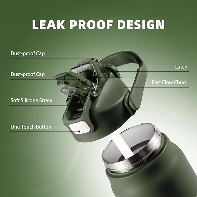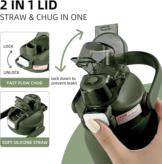- 【2 In 1 Dust-Proof Lid】2 In 1 Straw & Chug lid for all drinking styles. Our water bottle comes with a dual functionality lid that allows you to chug or sip without having to change the lid. Perfect for any indoor and outdoor activities.