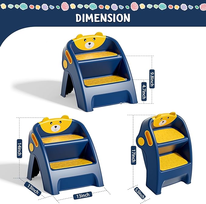 - Toddler Step Stool, Kids Step Stool Bathroom Sink Potty Training Aid Foldable Step Stool Anti-Slip Anti-Tip Design, Plastic Step Stool Height Adjustable Safety Montessori Learning Tool Hand Washing Kitchen Helper Nursery Bedroom boy girl