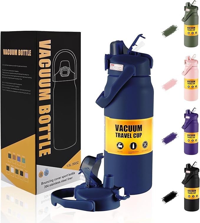 50oz/1.5L Insulated Sports Water Bottle, Stainless Steel Double Wall Water Jug with Handle, 2-in-1 Chug Spout and Straw Lid with Lock Cover for School, Outdoor, Sports & Travel, Navy Blue