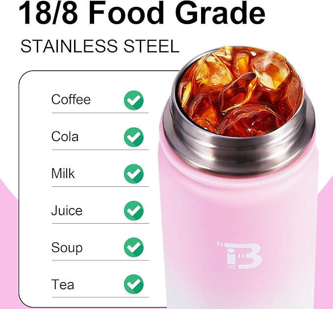 - DOUBLE WALL INSULATION: Our water bottle is made from high-quality 18/8 food-grade stainless steel, rust-proof, BPA-free, lead-free, and easy to wash. This wide mouth water bottle features double-walled vacuum insulation, which can keep your beverages cold for 24 hours and hot for 12 hours with a fresh taste. The wide mouth design is perfect for ice cubes and easy to clean.