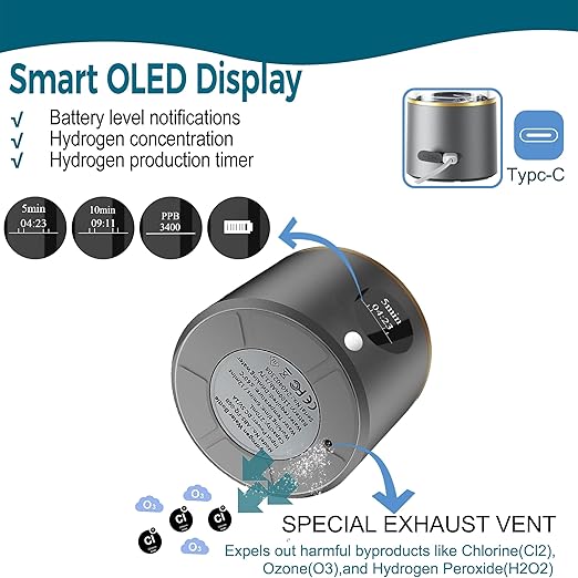 • 【Smart OLED Display】User-friendly display features include battery level notifications (so you never worry about forgetting to charge your hydrohealth water bottle), hydrogen production timer, hydrogen concentration, and one-touch mode switching, making it easy to operate.