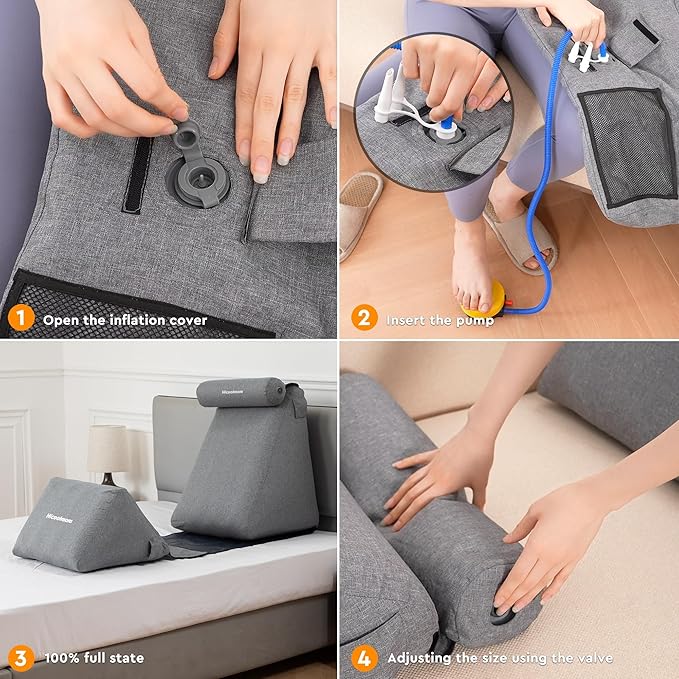 - Wedge reading Pillow- inflatable versatile bed wedge pillow adapt swiftly to your body shape and height, ensuring a secure fit without any slipping. Say goodbye to knee, legs, shoulder and neck pain as our wedge pillows improve circulation.specially crafted to alleviate discomfort after injuries. You could the pillows in any way, and place to any place you like.Give a Foot Pump