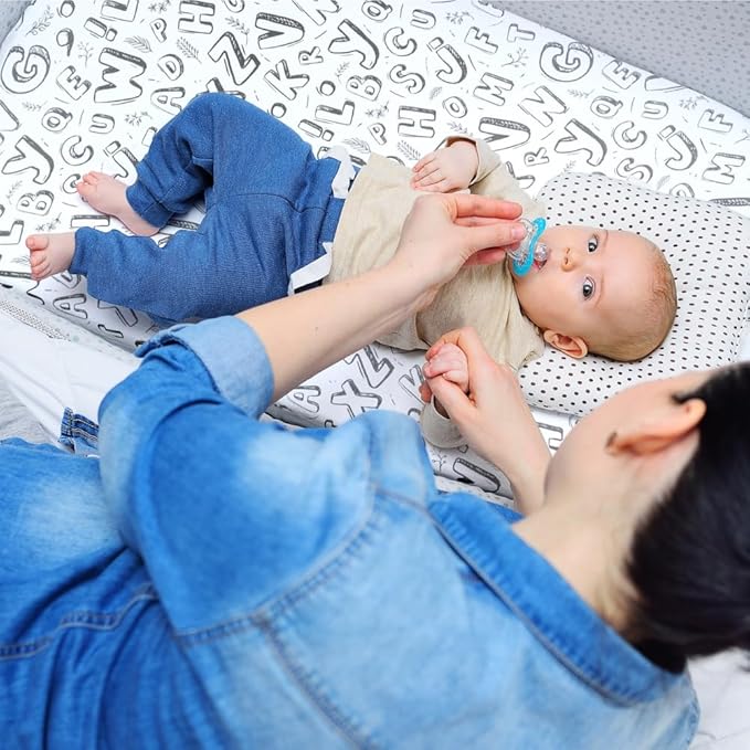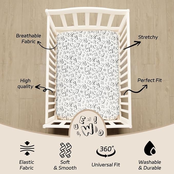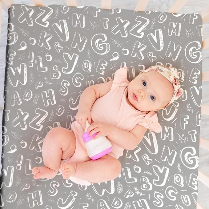 4 Pack Fitted Pack N Play Sheets for Baby Boys Neutral Unisex Breathable Soft Toddler Mini Crib Sheets for Pack and Play Mattress (Letter Print)