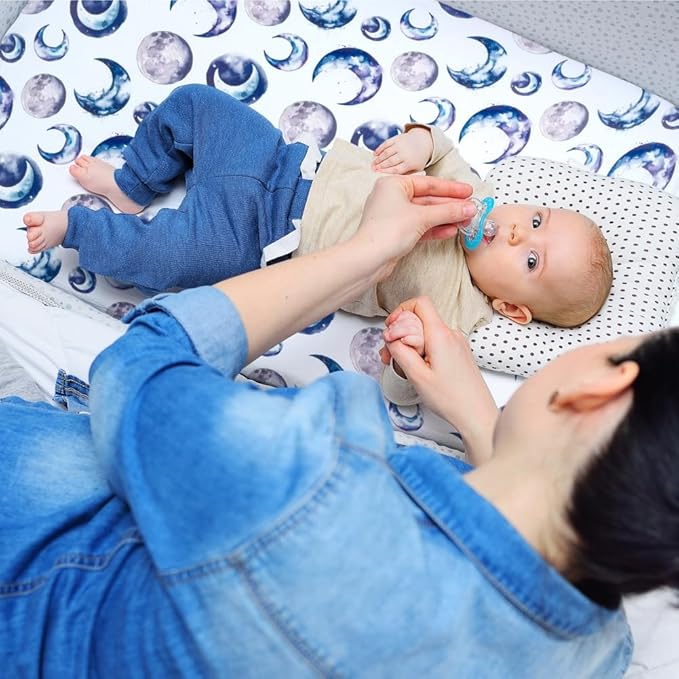 - HIGH QUALITY COMFORTABLE & BREATHABLE: Made from breathable and high-quality material, the sheets will not fade with bright color and long-time to use. The material of pack n play sheets is very comfortable and breathable. Make sure the fitted cloud letter and moon Pack n play sheets will keep babies cozy and comfortable.
