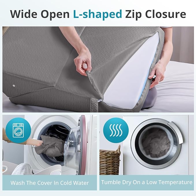 - REMOVABLE & WASHABLE COVER: The SASTTIE incline pillow for sleeping comes with a cover made of premium air layer fabric, ensuring maximum breathability and comfort. Featuring an L-shaped wide-opening zipper, the cover is easy to remove and machine wash, keeping your wedge for bed hygienic and fresh. Enjoy the convenience of maintaining a clean sleep environment with minimal effort.