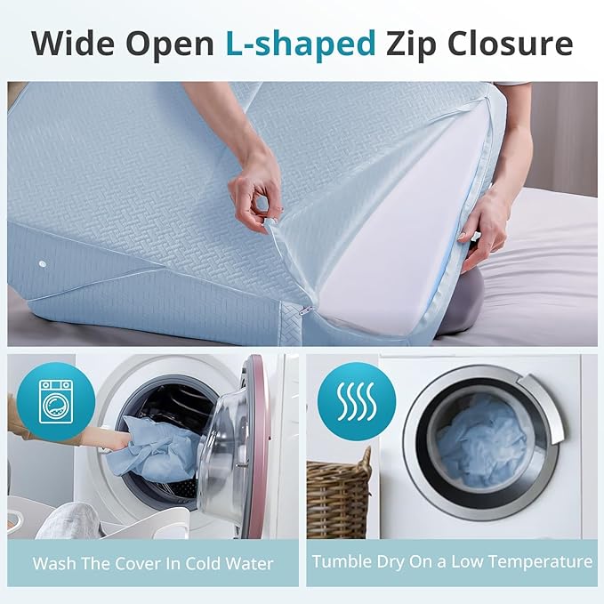 - REMOVABLE & WASHABLE COVER: The SASTTIE incline pillow for sleeping comes with a cover made of premium air layer fabric, ensuring maximum breathability and comfort. Featuring an L-shaped wide-opening zipper, the cover is easy to remove and machine wash, keeping your wedge for bed hygienic and fresh. Enjoy the convenience of maintaining a clean sleep environment with minimal effort.