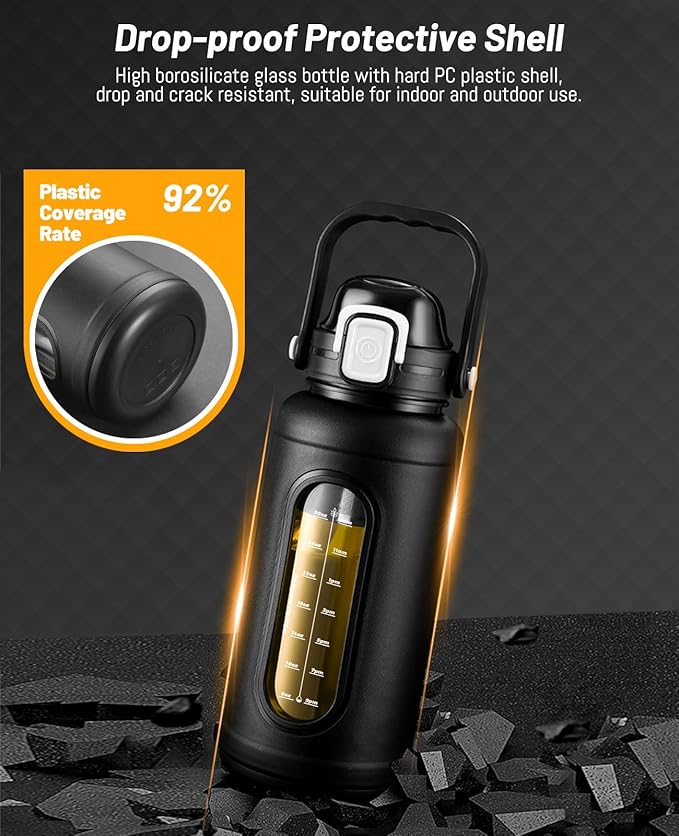 - UNBREAKABLE GLASS WATER BOTTLE: The heavy-duty protective sleeve is made of hard shatterproof PC which provides strong protection for the internal high borosilicate glass water bottle. It has better protection effect than conventional Neoprene or silicone sleeve. No longer afraid of falling and hitting. Frosted surface of external protective shell let you easy to grip, and reduces sweats or condensation.