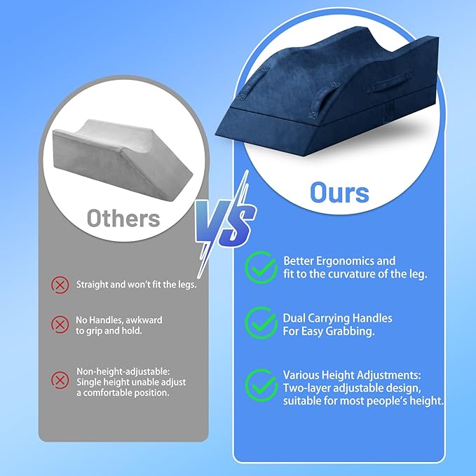- Ergonomic Design for Optimal Recovery: Our wedge pillows are specially designed with a 45 deg, making them ideal for post-surgery recovery, leg injuries, or reducing swelling. The ergonomic U-shaped groove and insert pad help keep your leg securely in place, preventing any slipping off while you sleep. This promotes better blood circulation and alleviates leg pain, especially for those undergoing knee surgery, hip or femur replacement, or recovering from leg injuries.