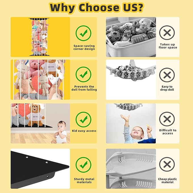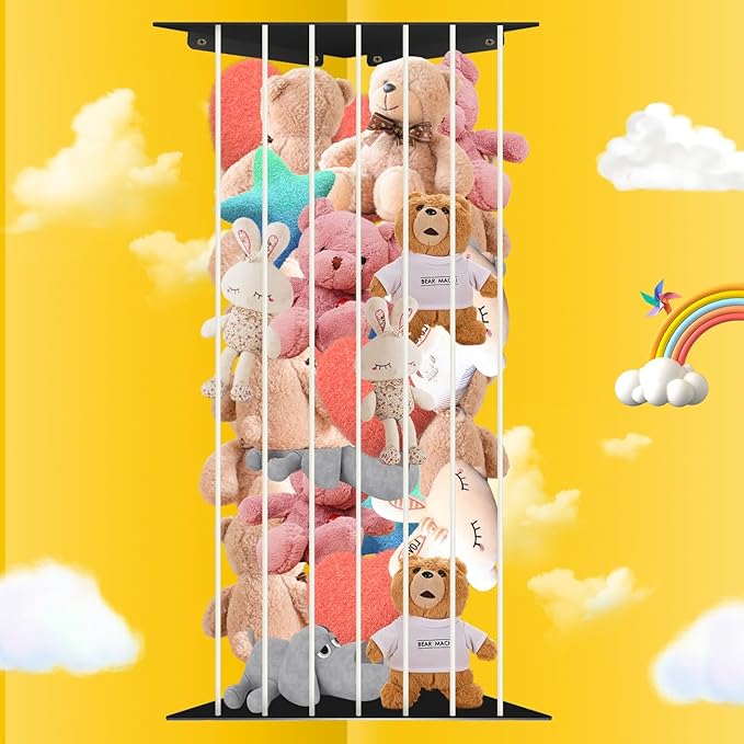 - Keeps toys organized: By hanging stuffed animals in a corner storage unit, you can keep them neatly organized and easily accessible for playtime. Due to use on wall corner, this toy storage stuffed animal holder will not take up extra floor space. Keep the stuffed animals, baby toys, jumbo toys, stuffed pet toys, and stuffed animals off the floor, and reclaim your space today. Premium stuffed animal storage is made of metal, with strong bearing capacity and durability. Patent Pending.
