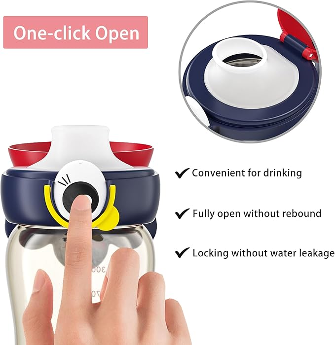 - 【Leak-proof Design】: One-click open cap, easy to open and close for kids above 3 years old. Leak-proof lid, ensures you no longer need to worry about messy spills. The bottle is extremely lightweight so that you can easily carry it around by the loop ring or just by grabbing it.