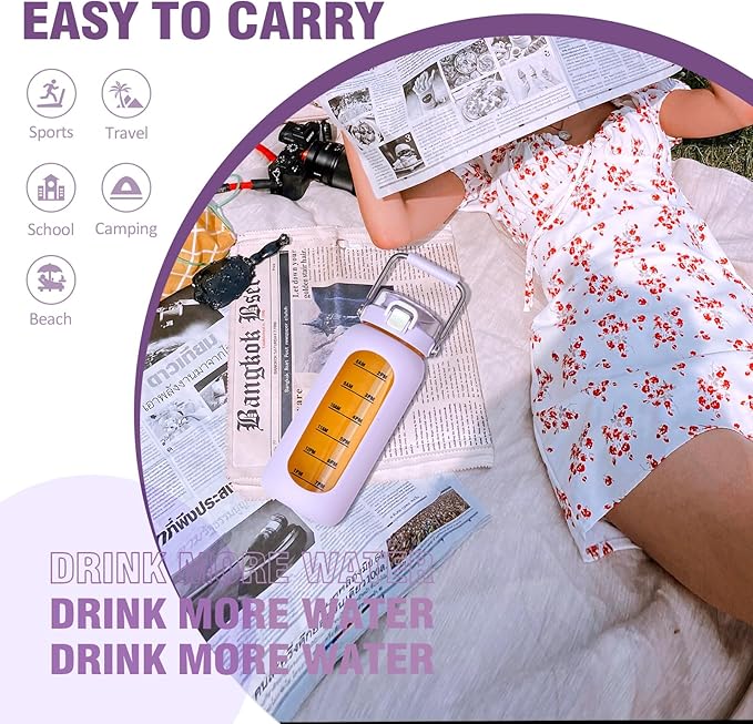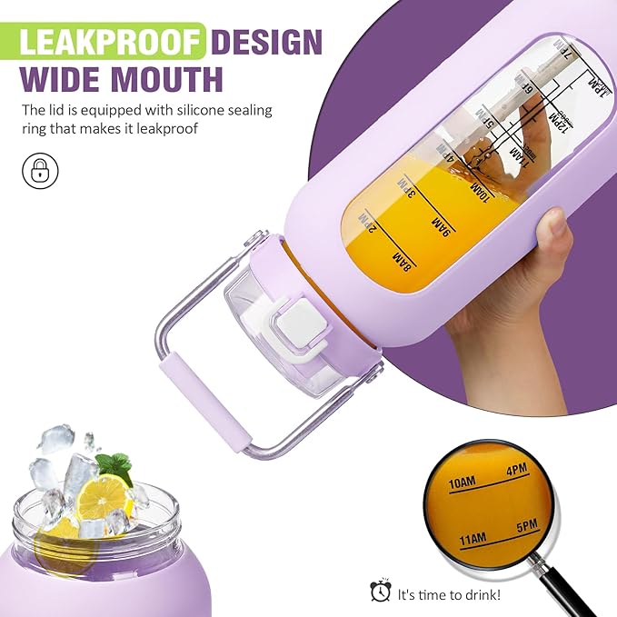 Kytffu 64 oz Glass Water Bottle with Straw and Stainless Steel Handle, Half Gallon Water Bottle with Silicone Sleeve and Time Marker, 2L Large Glass Bottle for Gym, School, Travel, Leak-proof (Purple)