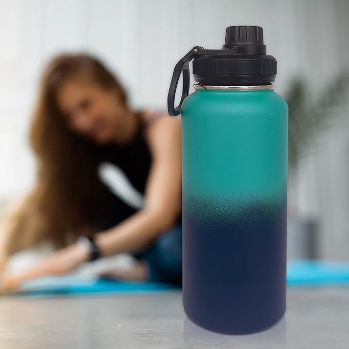 1pack 32 oz Insulated Water Bottle With Straw, Stainless Steel Sports Water Cup Flask with 2 Lids, Wide Mouth Travel Thermal Mug,Blue gradient